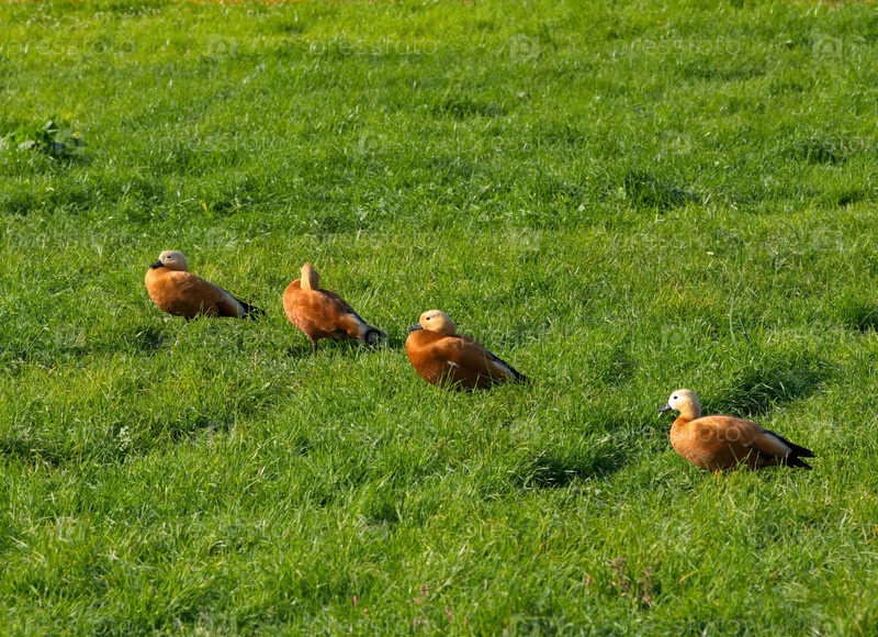 Россия, Москва. Небольшая стайка красных уток (огарь) безмятежно отдыхает в городском парке Царицыно