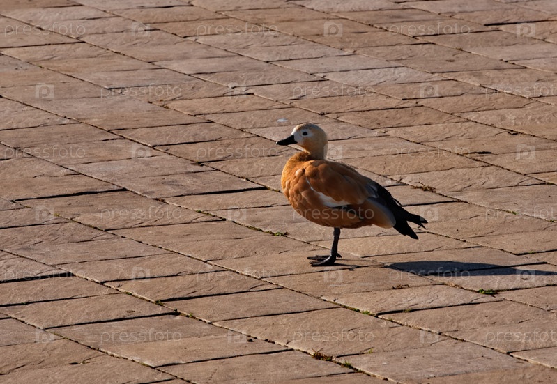Россия, Москва. Небольшая стайка красных уток (огарь) безмятежно отдыхает в городском парке Царицыно