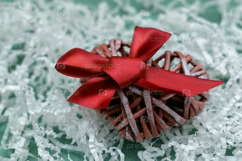Форма сердца ручной работы с ярким алым бантом, концепция подарка для близких, свадьба, день рождения, Международный женский день, 8 марта, День святого Валентина, 14 февраля, День матери