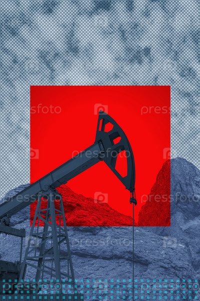Прикольный коллаж с промышленной нефтяной вышкой. Художественный плакат, концептуальный дизайн шаблона или обложка журнала. Насос Джек