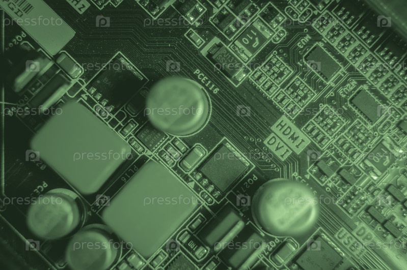 Крупный план материнской платы с установленными на ней микрочипами и компонентами. Фон электроники. Селективный фокус