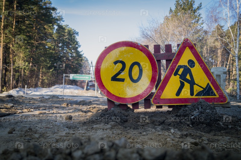 Реконструкция дороги. Знаки ремонта дорог и ограничения скорости на опасном участке. Предупреждающие знаки опасности. Селективный фокус