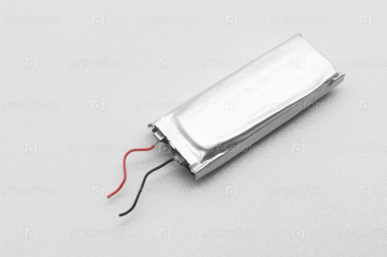 Литий-полимерный аккумулятор на белом фоне компактная небольшая литиевая батарея для микроэлектроники перезаряжаемый пакет LIPO селективный фокус