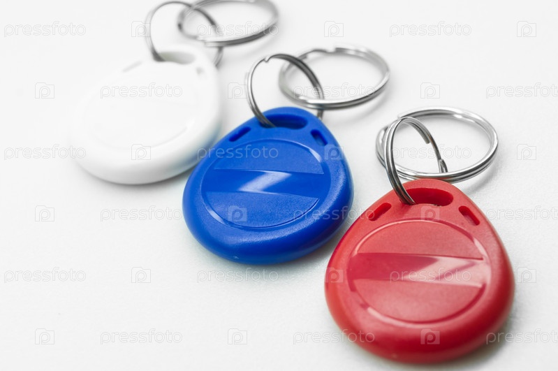 Ключевой крючок с RFID-меткой. Пластиковый клонированный бесконтактный электронный радиоключ для домашнего телефона. Метка NFC. Цвета российского флага. Выборочный фокус