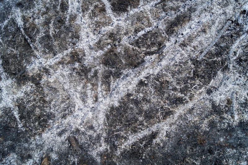 Выжженная земля. Последствия лесного пожара. Пепел от сгоревших веток и растений в лесу. Экологическая катастрофа. Селективный фокус