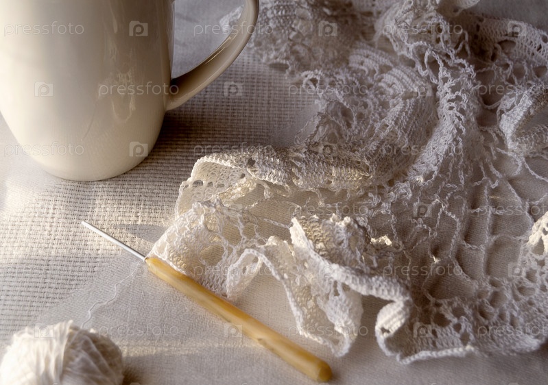 Кружевная белая салфетка лежит на льняной скатерти. Рядом лежит вязальный крючок и стоит чашка цвета слоновой кости. Вязание крючком, уютное рукоделие