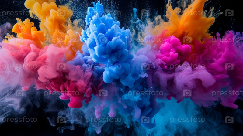 Красочный взрыв порошка на черном фоне. Абстрактные брызги частиц пыли пастельного цвета