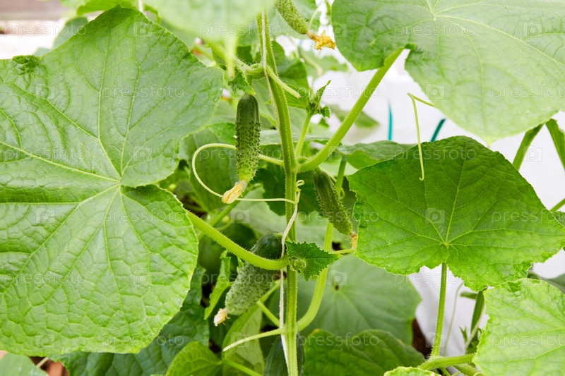 Молодые зеленые огурцы растут в теплице