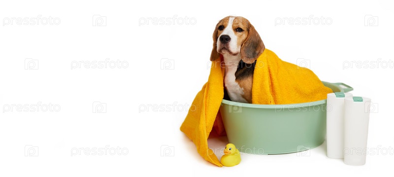 Собака-бигль в желтом полотенце после купальных костюмов в тазике