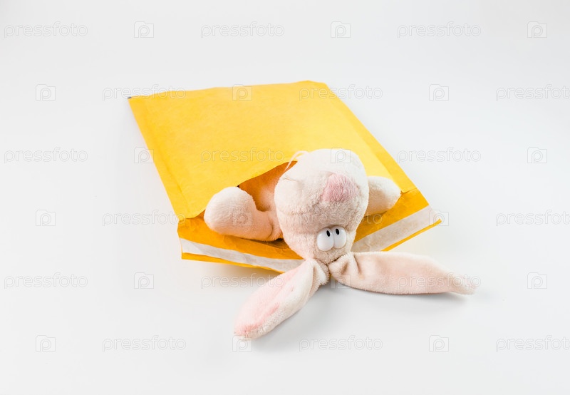 Игрушечный зайчик лежит в конверте