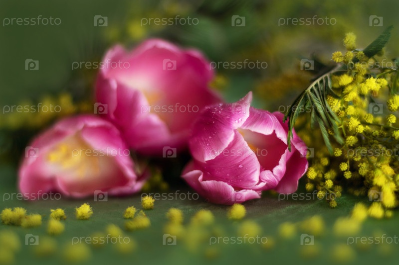 Весенний букет тюльпанов и мимозы на 14 февраля, любовь и мир, День Святого Валентина, 8 марта, свадьба, день рождения, День матери, размытый фон, боке