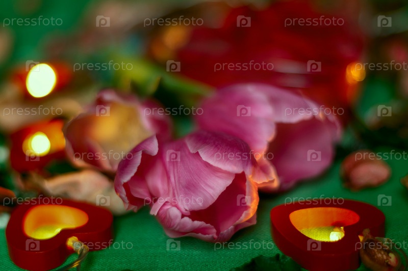 Букет тюльпанов, свечи и подарки, открытка на 14 февраля, День святого Валентина, 8 марта, свадьба, день рождения, день матери, размытый фон, боке