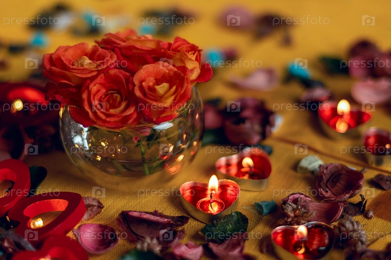 Букет роз, свечи и подарки, открытка на 14 февраля, День Святого Валентина, 8 марта, свадьба, день рождения, день матери, размытый фон, боке