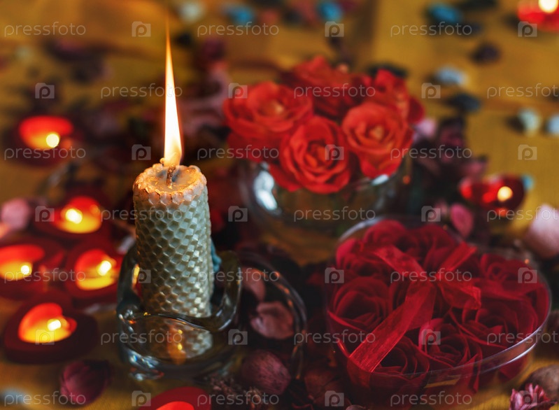 Букет роз, свечи и подарки, открытка на 14 февраля, День Святого Валентина, 8 марта, свадьба, день рождения, день матери, размытый фон, боке