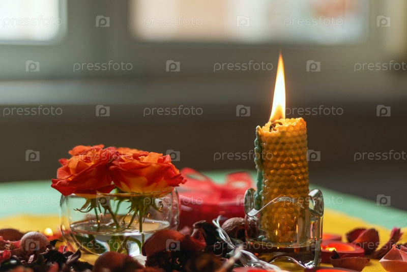 Букет роз, свечи и подарки, открытка на 14 февраля, День Святого Валентина, 8 марта, свадьба, день рождения, день матери, размытый фон, боке