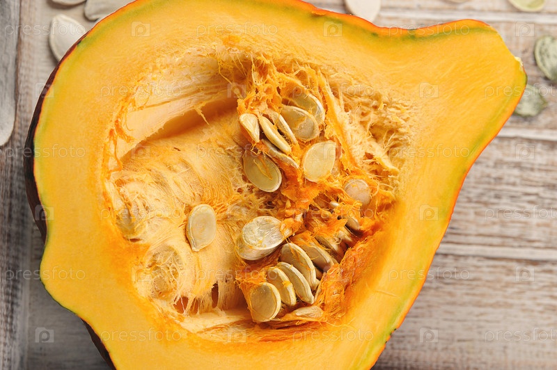 Тыква и тыквенные семечки разрезаны пополам на деревянном фоне