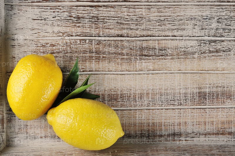 Желтые лимоны с зелеными листьями на деревянном фоне