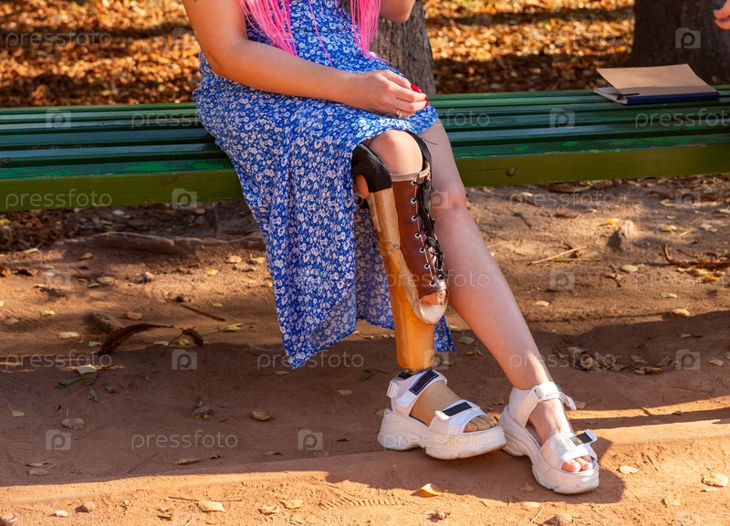 Красивая молодая женщина с ампутированной ногой в платье сидит на скамейке в парке в солнечный день. Жизнь продолжается несмотря ни на что