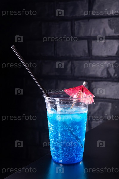 Голубой лимонад с кубиками льда в пластиковом стакане, украшенном зонтиком и соломкой на деревянном прилавке у кирпичной стены