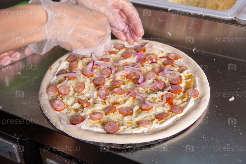 Шеф-повар готовит классическую итальянскую пиццу с сосисками, грибами и помидорами