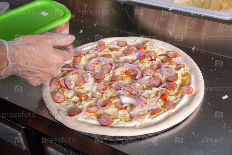 Шеф-повар готовит классическую итальянскую пиццу с сосисками, грибами и помидорами. Повар посыпает пиццу нарезанным луком