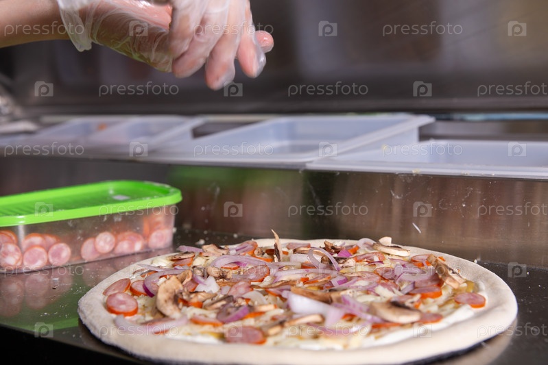 Шеф-повар готовит классическую итальянскую пиццу с сосисками, грибами и помидорами. Повар посыпает пиццу грибами