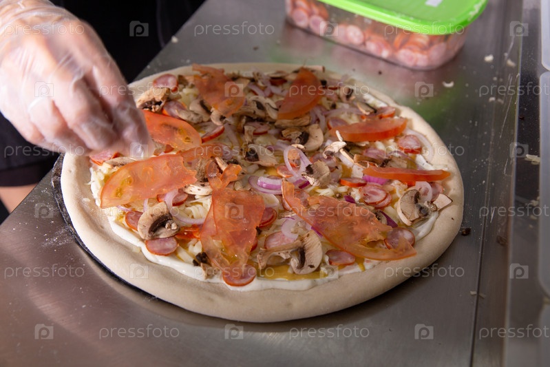 Шеф-повар готовит классическую итальянскую пиццу с сосисками, грибами и помидорами