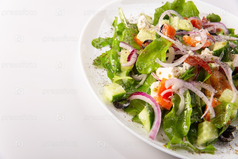 Традиционный греческий салат со свежими ингредиентами, сыром фета, оливками, красными помидорами, огурцами и зеленью в белой тарелке, на белом фоне. Крупным планом, скопируйте пространство