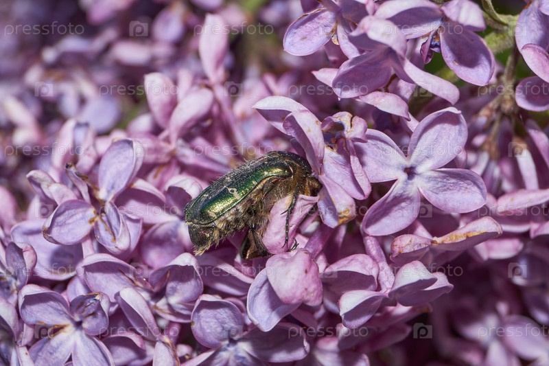 Бронзовый жук (Cetonia aurata) собирает нектар и пыльцу из цветов куста сирены (Syringa)