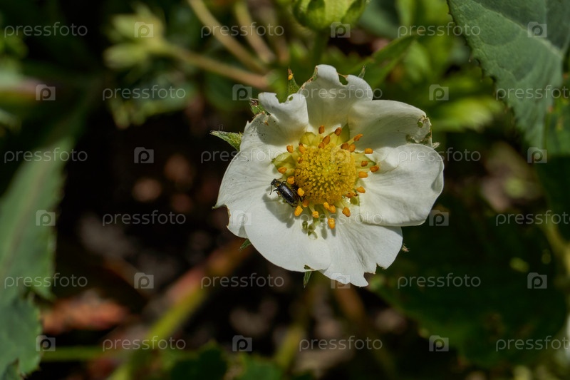 Цветы клубники на фоне листьев и земли. В саду цветет клубника