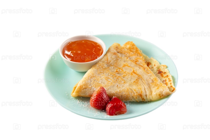 Домашние блины, сложенные треугольниками, с персиковым джемом и клубникой на синей тарелке, изолированной на белом фоне