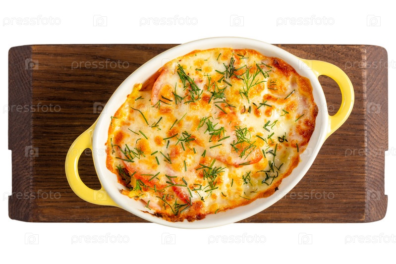 Капустная запеканка с чечевицей и сливками в керамической форме для выпечки на деревянном столе, изолированном на белом фоне, вид сверху