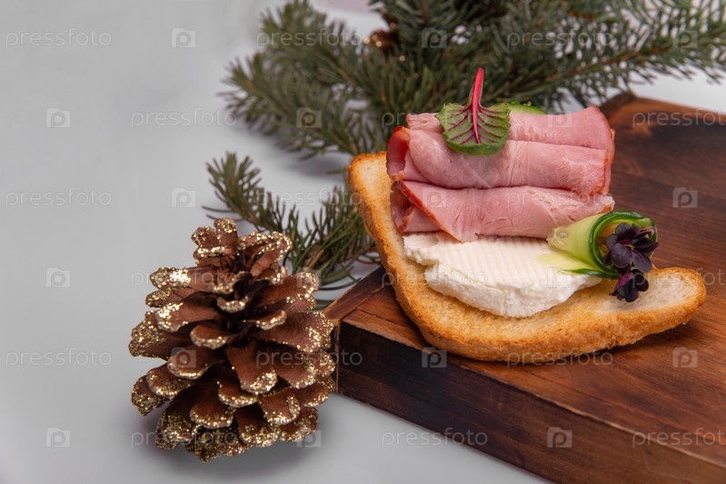 Сэндвич с ветчиной, огурцом и творогом, украшенный зеленью и рождественскими элементами