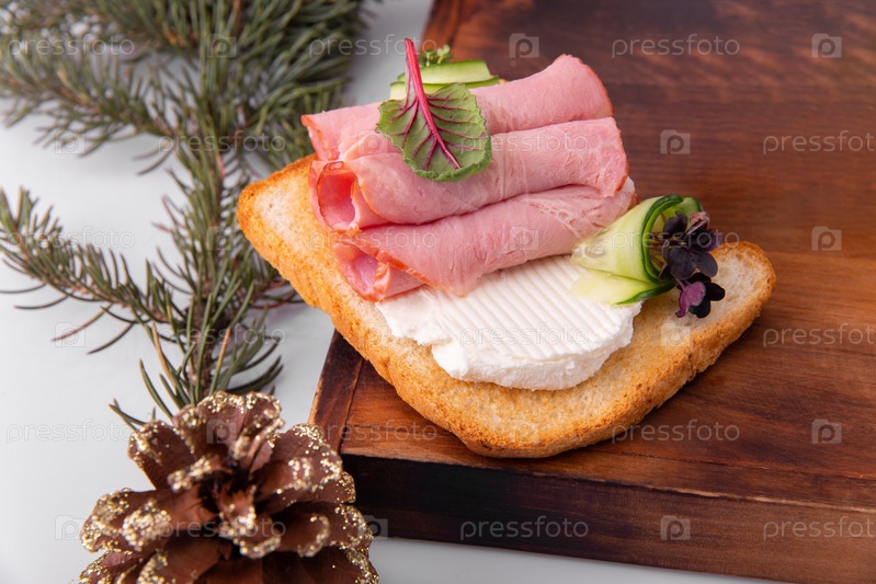 Сэндвич с ветчиной, огурцом и творогом, украшенный зеленью и рождественскими элементами