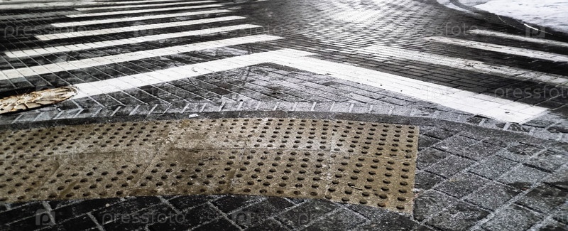 Концептуальный снимок разметки пешеходного перехода на зимней дороге. Город