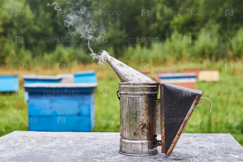 Курильщик на крыше улья на пасеке крупным планом