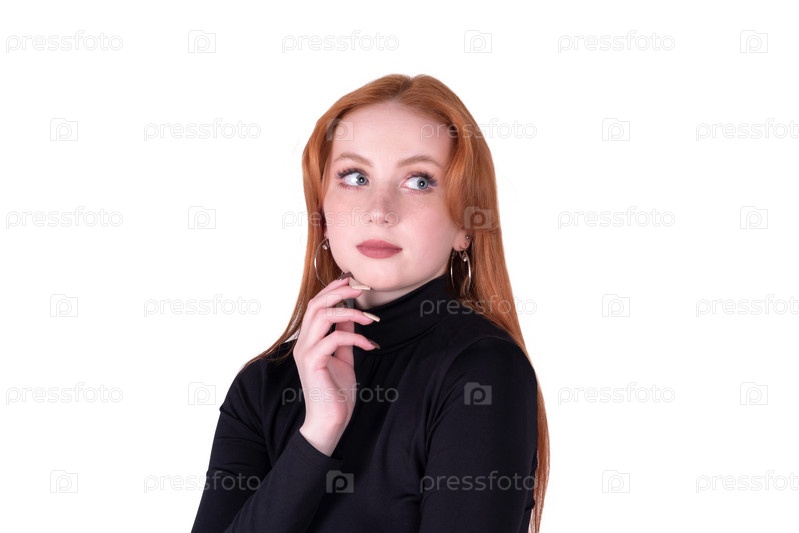 Портрет задумчивой молодой женщины на белом фоне