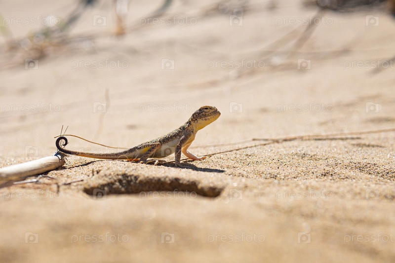 Ящерица-жабоголовая агама в пустыне среди сухих стеблей