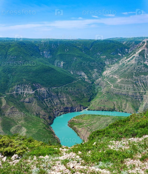 Горный пейзаж, вид на глубокий каньон с голубой водой, долина реки Сулак в Дагестане