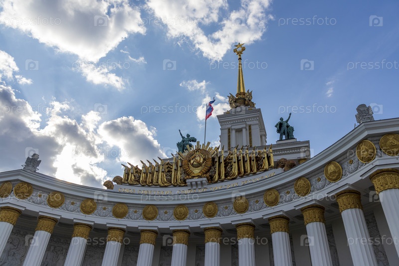 Москва, Россия - 07.09.2023 - Снимок главного входа на площадку Выставки достижений народного хозяйства, известной как ВДНХ. Ориентир