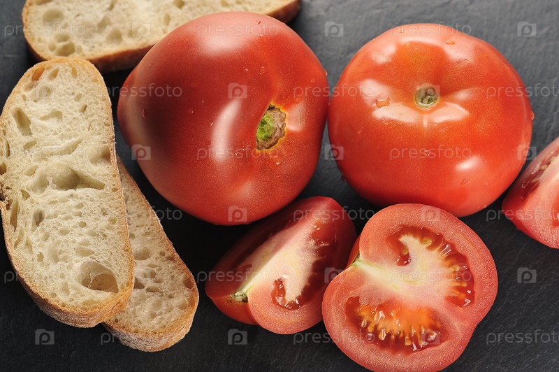 Красные помидоры и чиабатта на черном камне