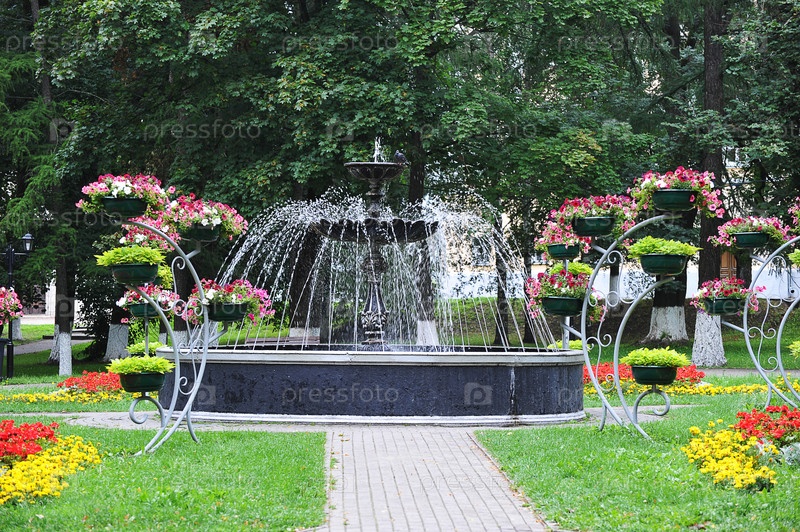 Летний фонтан с цветами в парке во Владимире, Россия