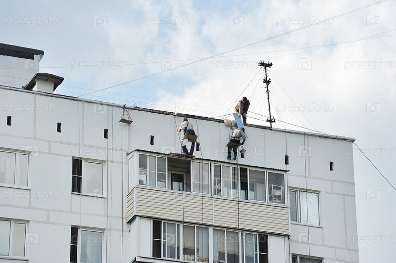 Неквалифицированный труд - гастарбайтеры работают на высотных работах на крыше дома в Москве