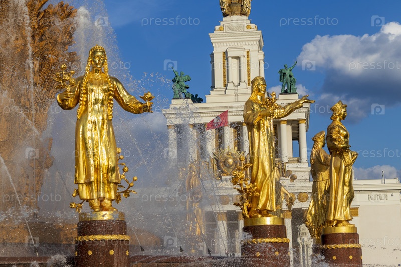 Москва, Россия - 07.09.2023 - Снимок знаменитого фонтана на площадке Выставки достижений народного хозяйства, известной как ВДНХ. Ориентир