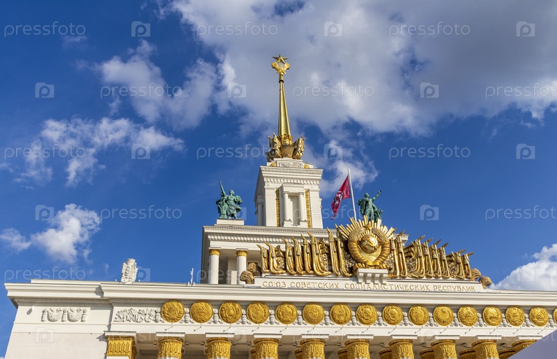 Москва, Россия - 07.09.2023 - Снимок скульптуры на вершине главного входа на площадку Выставки достижений народного хозяйства, известной как ВДНХ. Ориентир