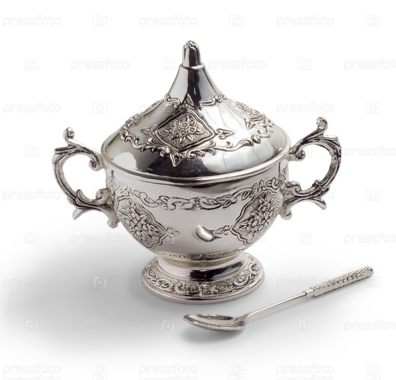 Старая винтажная сахарница и ложка, изолированные на белом фоне