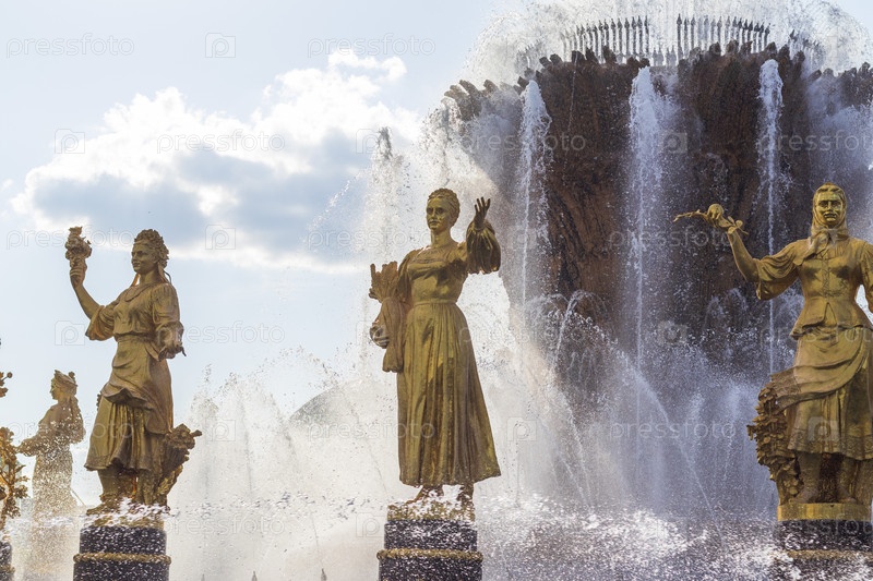 Москва, Россия - 07.09.2023 - Снимок знаменитого фонтана на площадке Выставки достижений народного хозяйства, известной как ВДНХ. Ориентир