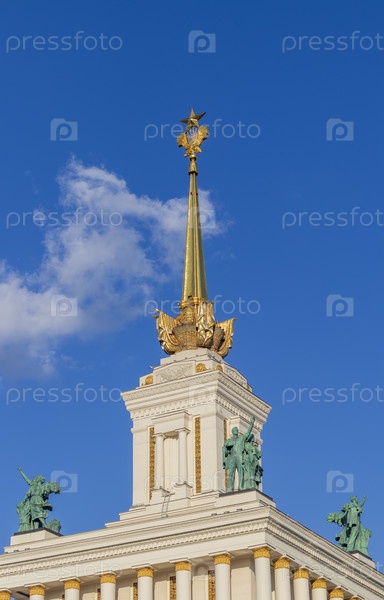 Москва, Россия - 07.09.2023 - Снимок скульптуры на вершине главного входа на площадку Выставки достижений народного хозяйства, известной как ВДНХ. Ориентир
