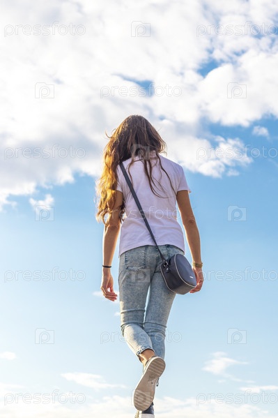Кадр молодой женщины, поднимающейся по лестнице. Концепция