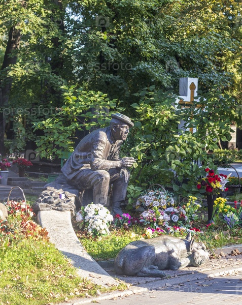 Москва, Россия - 08.06.2023 - Мемориал известному советскому российскому художнику и актеру Юрию Никулину на Новодевичьем кладбище. История